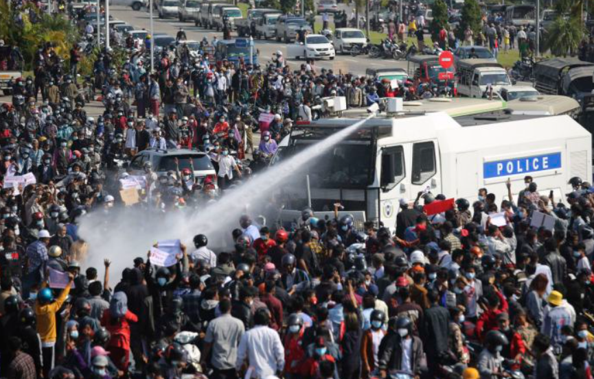Yangon:  Tension in the confrontations between the authorities and demonstrators against last week's coup in Myanmar boiled over Monday, as police fired a water cannon at peaceful protesters in the capital Naypyitaw.
