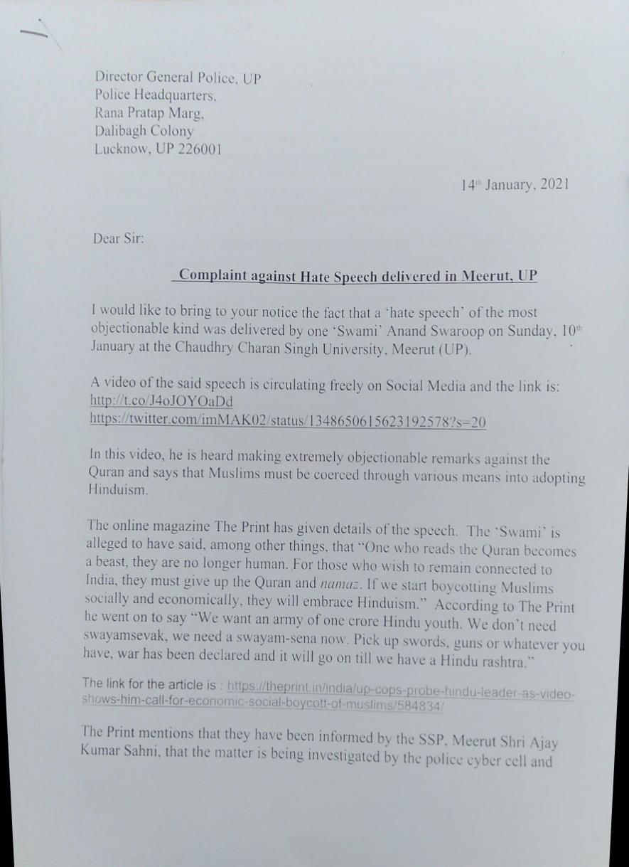 In another incident, Swami Anand Swaroop, head of an organisation named  Shankaracharya Parishad, was purportedly seen calling for an economic boycott of Muslims at a function organised at Chaudhary Charan Singh University in Meerut.