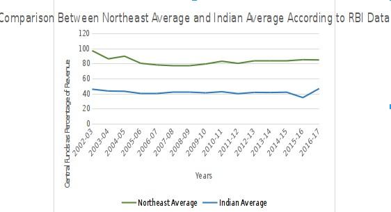 As the above graph (based on RBI data) makes it clear, since 2002, Gross Transfers of funds from the Union Government to the 8 states of the Northeast, make up a disproportionately high portion of the states’ revenue, mostly in the 80 to 100 percent range. This clearly displays the dependence of the 8 states on funding from the Union Government. Part of it is explainable by the fact that all these states are economically backward, and they are border states with sensitive issues of ethnic strife and insurgencies. But this does not explain why, even so many years after the formation of these states, there has been insignificant economic development which would enable more local revenue and less dependence on central funds.