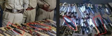 Four images are being shared on social media with two different claims. The first image shows a huge pile of swords. The next picture shows knives on a table. The third one shows police officers inspecting the swords and the last image shows a police team standing behind a group of four people.